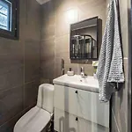 Badrumsfaciliteterna i Rukanmetsae, Cottage, Ruka inkluderar också en duschkabin och en separat toalett. I badrummen finns också hårtorkar och badrockar för din bekvämlighet.